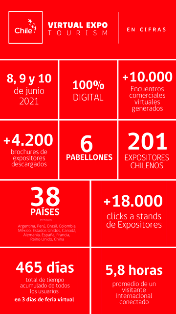 SANTIAGO (Chile), 18 de Junio — 2021.- Con éxito terminó Chile Virtual Expo Tourism, la principal feria turística multimercado organizada por nuestro país durante este primer semestre, de la mano de la Subsecretaría de Turismo, Sernatur y ProChile.