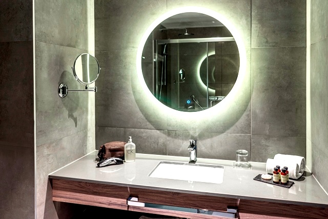 A través de la amplitud espacial y el contraste de texturas y acabados, Pullman El Bosque crea una experiencia donde el mobiliario, el arte, la tecnología y la iluminación se unen para dar la bienvenida. Mediante una composición de más de 25 lámparas Halo Jewel, se impone un “WOW Effect” logrando captar la atención incluso desde el exterior. Su mobiliario adaptativo, bancas circulares y elementos decorativos generan un ambiente acogedor y habitable, cuyo remate final se obtiene con la obra del grupo Trimex Collective, donde nuevamente la luz cobra vida y mediante la instalación de un elemento geométrico se pueden representar distintas escenas que simulan paisajes naturales dentro de la atmósfera del lobby, todo pensado en invitar al usuario a habitar el espacio, ya sea para actividades de negocios o recreativas, y disfrutar de sus atributos.