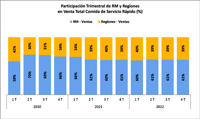 Las ventas reales de comida de servicio rápido en regiones marcaron en el cuarto trimestre de 2022 un alza real anual de 9,4%, cerrando el año con un aumento real de 27,3%. Respecto del tercer trimestre.