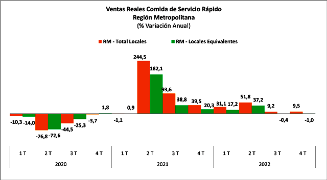 SANTIAGO (Chile), 22 de Febrero – 2023.-   El índice de servicio de comida rápida se aceleró en el último trimestre del año pasado, cerrando el 2022 con un alza real de 24,7%, lo que se debe en parte a una baja base de comparación, pues el 2021 se mantuvieron confinamientos y restricciones que afectaron al sector.