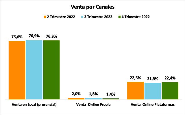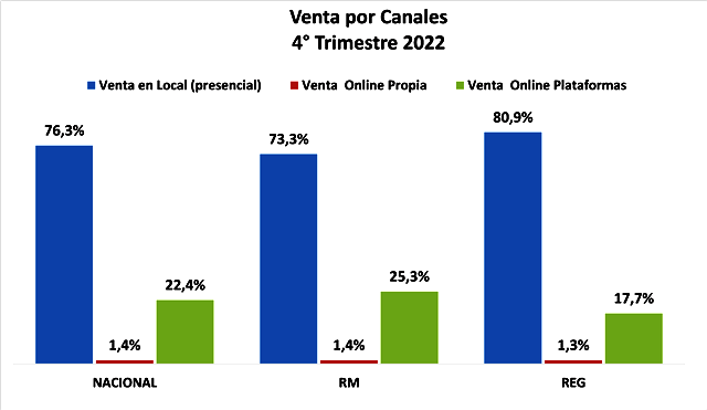 Desde el segundo trimestre 2022, se comenzó a incluir en este indicador las ventas por canal. De esta manera, se evidencia que a nivel nacional en el cuarto trimestre del año pasado un 76,3% de las ventas son presenciales, un 1,4% se realizan a través de plataformas digitales propias y un 22,4% a través de plataformas externas; es decir, en total un 23,8% de las ventas son digitales.
