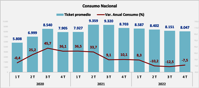 El consumo promedio por boleta (expresado en pesos de diciembre 2022), alcanzó un valor de $8.047 en el cuarto trimestre de 2022, lo que significa una baja anual de 7,5% real respecto a igual período de 2021, marcando un tercer período de caída y una baja de 1,3% respecto del trimestre anterior. De esta manera, el 2022 cierra con un consumo promedio de $8.297, cayendo 6% real frente al 2021; sin embargo, al comparar con 2019, es un 43,7% superior.